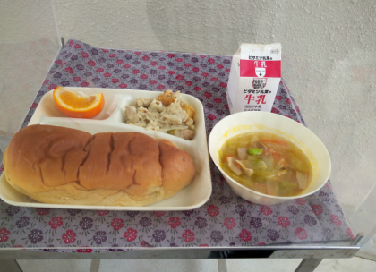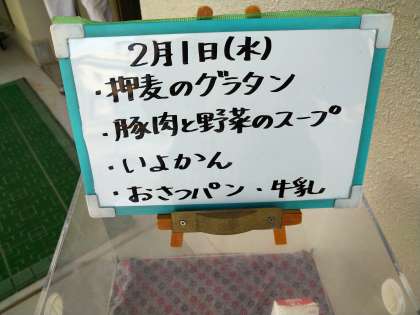 今日の給食メニューは、押し麦のグラタン、豚肉と野菜のスープ、いよかん、おさつパン、牛乳でした。