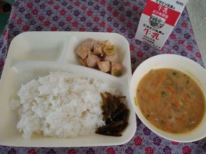 今日は、まぐろを白ねぎと一緒に焼き物機で焼いた「まぐろの甘辛焼き」、具だくさんの「豚汁」、そして「茎わかめのつくだ煮」、ご飯、牛乳の献立でした。皆さん、お味はいかがでしたか?
