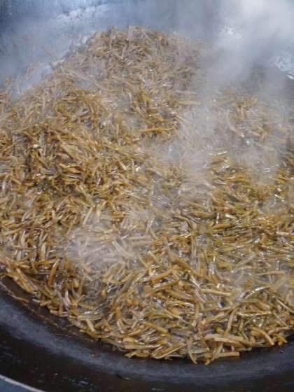 今日は茎わかめのつくだ煮です。茎わかめはわかめの葉の太くかたい芯の部分で、コリコリとした食感が特徴です。これをだし汁、砂糖、みりん、こい口しょうゆで味付けし、煮詰めて仕上げます。ご飯によく合う一品です。