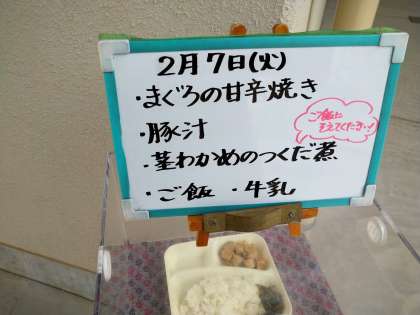 本日の給食のメニューは、まぐろの甘辛焼き、豚汁、くきわかめのつくだ煮、ごはん、牛乳でした。 温かい給食、いつもありがとうございます!