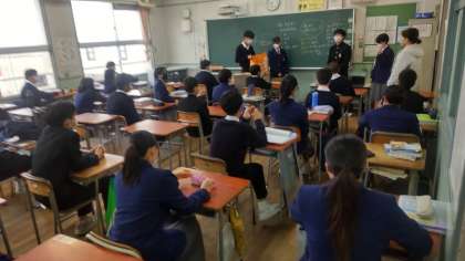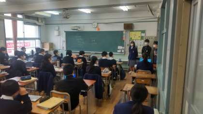 本日、1限目前に、3年生の各クラスの学級代表が、先日の2年生からのコルクボード(卒業記念品)のお礼に、2年生の各教室へ行きました。