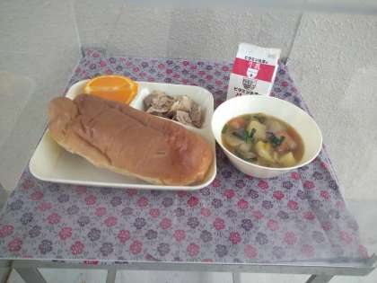 今日の給食は、豚肉のオイスターソース焼き、あつあげと野菜の中華煮、デコポン、黒糖パン、牛乳でした。