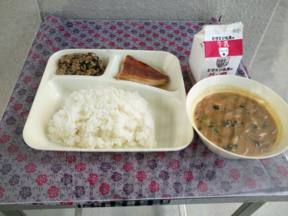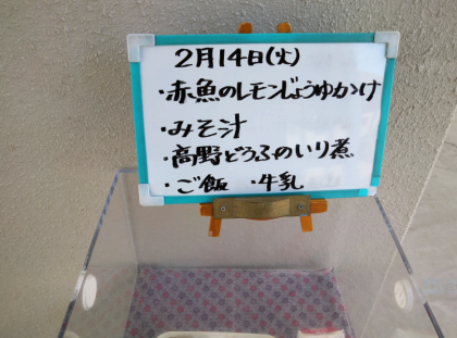 今日の給食は、赤魚のレモンじょうゆかけ、みそ汁、高野どうふのいり煮、ごはん、牛乳でした。