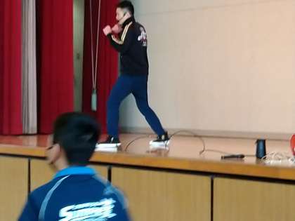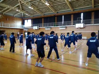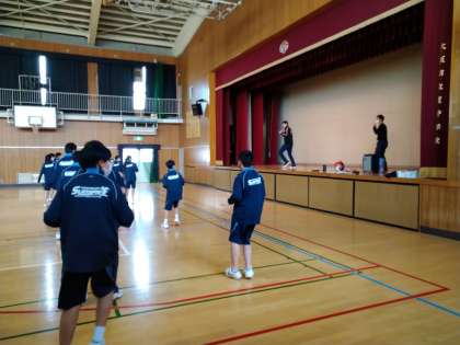 舞台の先生の動きを手本に、みんな一所懸命に取組んでいました。先生方も一緒に授業に参加している姿がたくさん見られました。明日、明後日も引き続きよろしくお願いいたします。