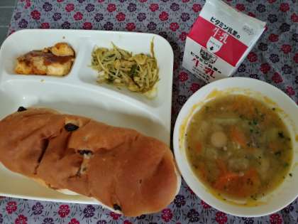 ☆給食室からこんにちは☆〜ポトフ、カレーソテー、焼きプリン、レーズンパン、牛乳〜