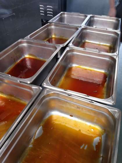 今日は焼きプリンの登場です。給食室で分量の鶏卵、牛乳、クリーム、砂糖をよく混ぜ合わせ、カラメルソースを敷いたミニバットに流し入れます。焼き物機で蒸し焼きにすること25分。きれいな焼き色が付いた焼きプリンの出来上がりです。焼き物機の蒸気からはとても甘いにおいが立ち込めてきました。手づくりの焼きプリンです。おうちでも作ってみてはいかがでしょうか。