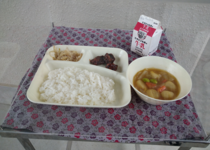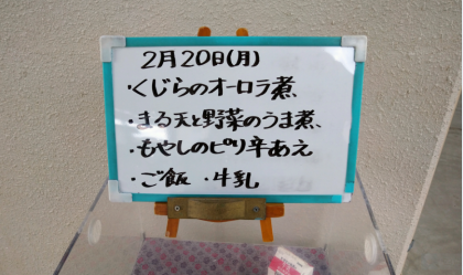 本日のメニューは、くじらのオーロラ煮、まる天と野菜のうま煮、もやしのピリ辛あえ、ごはん、牛乳でした。
