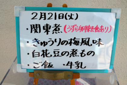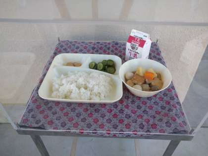 今日の給食は、関東煮、きゅうりの梅風味、白花豆の煮もの、ごはん、牛乳でした。
