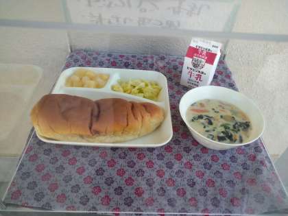 今日の給食は、ほうれん草のクリームシチュー、キャベツのサラダ、洋なし(カット缶)、おさつパン、牛乳でした。