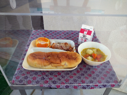 今日の給食は、とうふのミートグラタン、押麦と野菜のスープ煮、デコポン、おさつパン、牛乳でした。