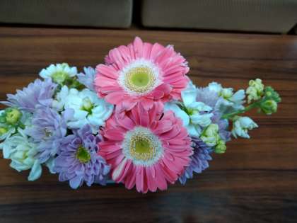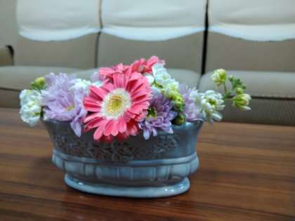 今日は週はじめの月曜日です。地域ボランティアの方がお花を活けに来校してくださいました。春の桜を連想させるような、とてもきれいな色彩のお花でした。毎週、美しいお花を活けていただき、ありがとうございます。