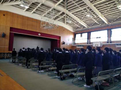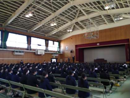 本日の5・6限目、3年生は卒業式の練習を行いました。今回が初めての練習です。学年主任の先生から、卒業式に向けての心構えや証書の受け取りなどの説明がありました。74期生みんなが、集中して取り組むことができました。