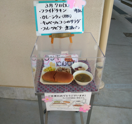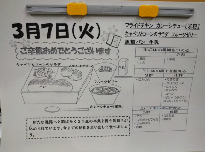 今日のメニューは、卒業記念メニューです!新たな進路へと羽ばたく3年生の卒業を祝う気持ちが込められています。今までの給食を思い出して食べてください。