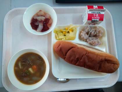 本日の給食のメニューは、フライドチキン、カレーシチュー(米粉)、キャベツとコーンのサラダ、フルーツゼリー、黒糖パン、牛乳です。