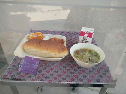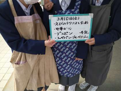 今日の給食メニューは、えびのチリソースいため、中華がゆ、デコポン、コッペパン、ブルーベリージャム、牛乳でした。