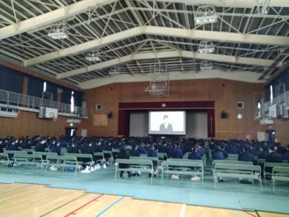 最後の学年集会は、3年生の先生方が作ってくださったムービーを鑑賞しました。1年生の入学式から3年生のこれまで、すべての行事等で見せてくれた笑顔等の「成長の足跡」を鑑賞しました。先生方のメッセージや、3年生の「合唱」も聞くことができました。合唱は、音楽の時間にみなさんが個別で歌った歌を繋ぎ合わせ、一つにした大作です。コロナ禍ではありましたが、すべての行事や授業に一所懸命に取組んだ74期生のみなさんや先生方の姿勢は、本当に素晴らしいです。