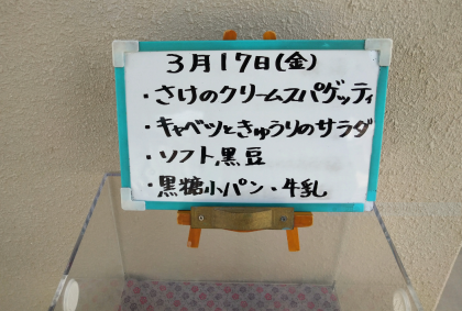 今日の給食のメニューは、さけのクリームスパゲティ、キャベツときゅうりのサラダ、ソフト黒豆、黒糖パン(小)、牛乳でした。