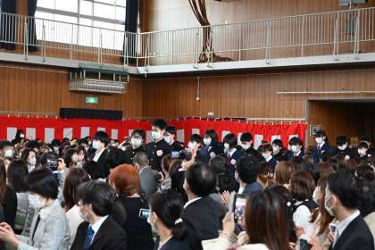 新入生入場、たくさんの拍手で迎えられました!担任の先生の誘導のもと、入場しました。新しいクラスのスタートでです!