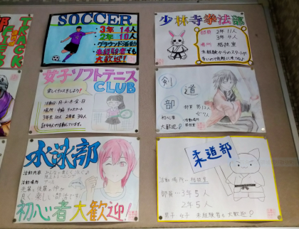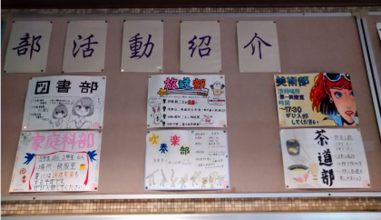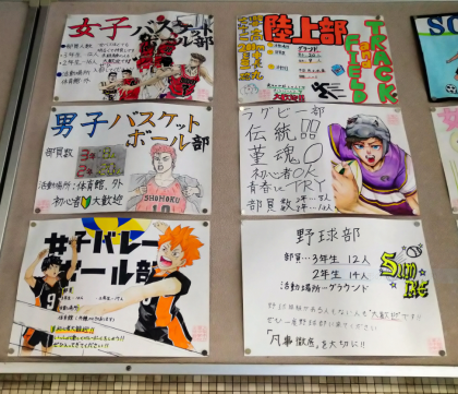 本校の玄関フロアーの所に、今年度版の部活動紹介ポスターが掲示されています。文化部・運動部の工夫の見られる様々なポスターです。