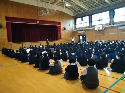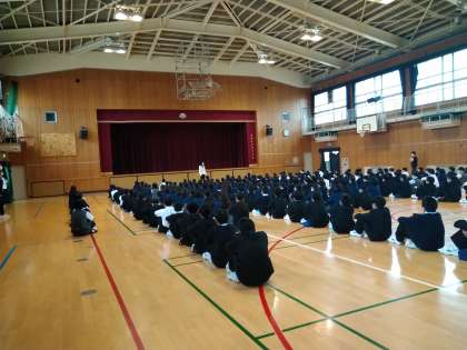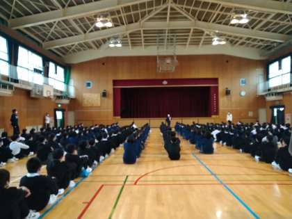 本日の朝、1年生の学年集会を行いました。集合は、早くできましたね。