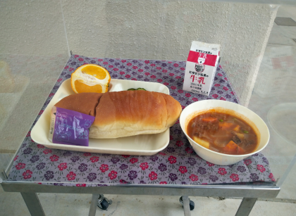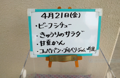 本日の給食は、ビーフシチュー、きゅうりのサラダ、あまなつかん、コッペパン、ブルーベリージャム、牛乳でした。