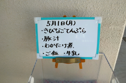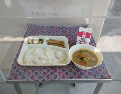 本日の給食のメニューは、きびなごてんぷら、豚汁、わかたけ煮、ごはん、牛乳でした。