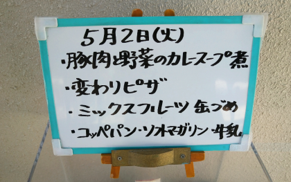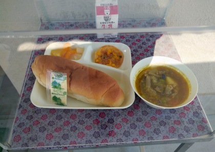 今日の給食のメニューは、豚肉と野菜のカレースープ煮、変わりピザ、ミックスフルーツ(缶)、コッペパン、ソフトマーガリン、牛乳でした。