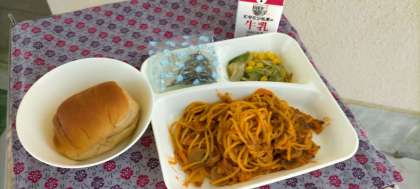 ミートスパゲッティ、レタスとコーンのサラダ、ミニフィシュ、黒糖小パン、牛乳です。
