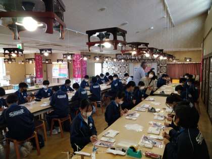 これからうどん作り体験開始です。まずは、うどん作りの前の準備をしています。講師の方のお話がはじまります。
