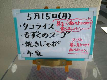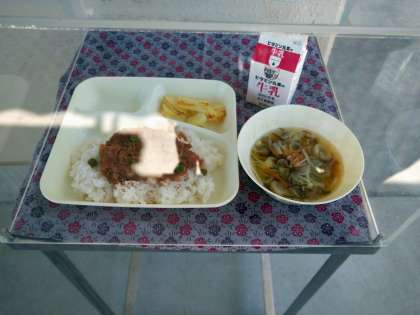 本日の給食のメニューは、タコライス、もずくのスープ、焼きじゃが、牛乳でした。