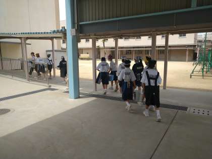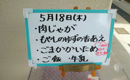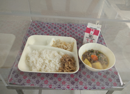 本日の給食のメニューは、肉じゃが、もやしのゆずの香あえ、ごまかかいため、ごはん、牛乳でした。