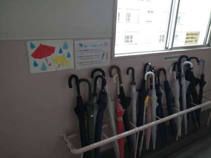 教室の前の廊下には、きちんと並べられた傘がありました。整理整頓、気持ちがいいものですね。