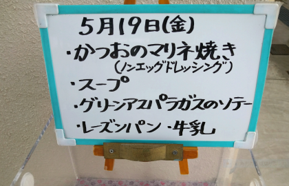 本日の給食のメニューは、かつおのマリネ焼き〔ノンエッグドレッシング〕、スープ、グリーンアスパラガスのソテー、レーズンパン、牛乳でした。