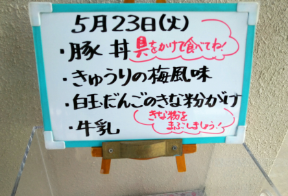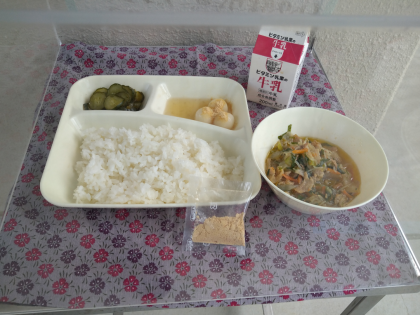 本日の給食メニューは、豚丼、きゅうりの梅風味、白玉だんごのきな粉がけ、ごはん、牛乳でした。