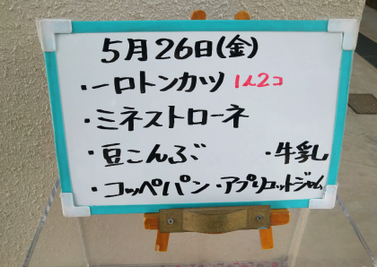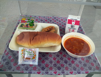 今日の給食は、一口トンカツ、ミネストローネ、豆こんぶ、コッペパン、アプリコットジャム、牛乳でした。
