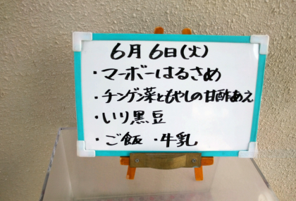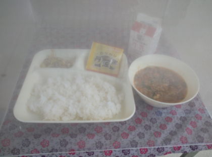 本日の給食のメニューは、マーボーはるさめ、チンゲン菜ともやしの甘酢あえ、いり黒豆、ごはん、牛乳でした。