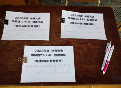 体育大会に先立ち、本日、学級旗コンテストを行いました。各学級の個性あふれる素晴らしい作品です!どの学級が最優秀賞を獲得するでしょうか?非常に楽しみです。