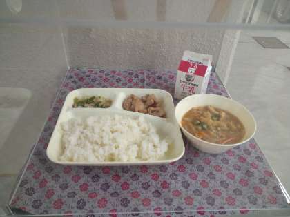 今日の給食のメニューは、鶏肉のしょうゆバター焼き、みそ汁、野菜いため、ごはん、牛乳でした。