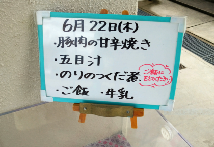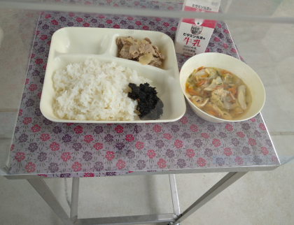 本日の給食のメニューは、豚肉の甘辛焼き、五目汁、のりのつくだ煮、ごはん、牛乳でした。
