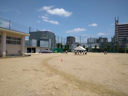 今日は、午前中、グラウンドでは陸上部が活動をしていました。写真は、ちょうど練習を終えたところでした。暑さに負けず、がんばっています!