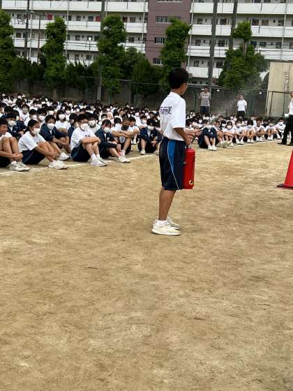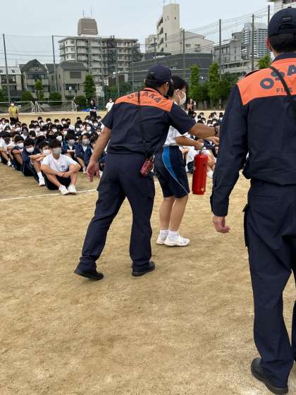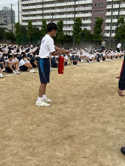 お話を伺ったあと、消化器の使い方について、説明していただきました。最後に代表生徒が消化器を使った体験を行いました
