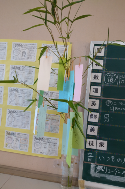 明日、7月7日は七夕です。星に願いを込めて…。教室を覗くと、笹が揺られ、短冊が掛けられていました。近づくと、そこには、各々の願い事が書き込まれていました。中には、「みんなが笑顔になりますように」というとても素敵な願い事を発見しました。