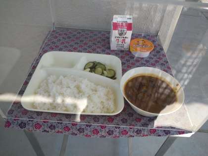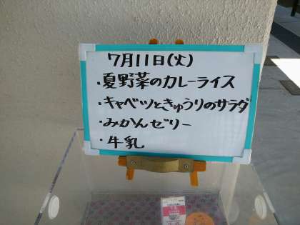 本日の給食のメニューは、夏野菜のカレーライス、キャベツときゅうりのサラダ、みかんゼリー、牛乳でした。