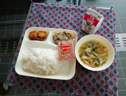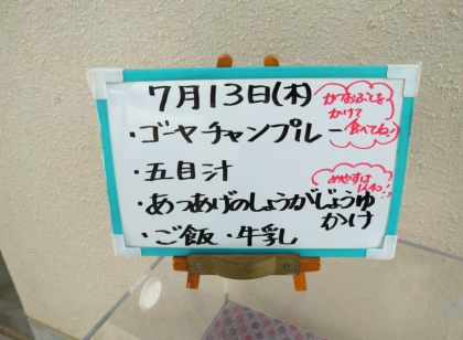今日の給食は、夏が旬の野菜の「にがうり(ゴーヤ)」を使ったゴーヤチャンプルーです。にがうり(ゴーヤ)には、ビタミンCが多く含まれています。
