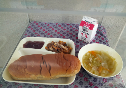 今日の給食メニューは、なすのミートグラタン、スープ、ダイスゼリー(ぶどう)、黒糖パン、牛乳でした。