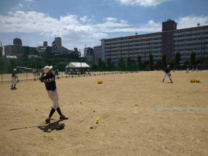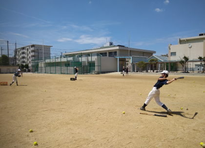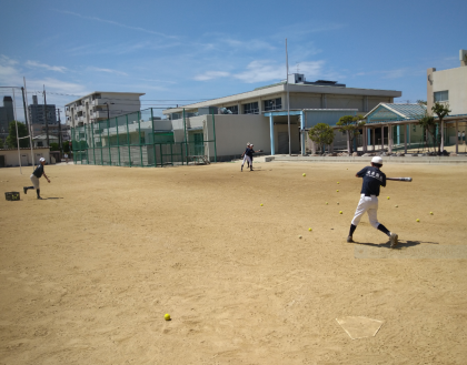 朝のグラウンドでは、野球部がロングティーをしていました。ナイスバッティングです!