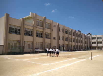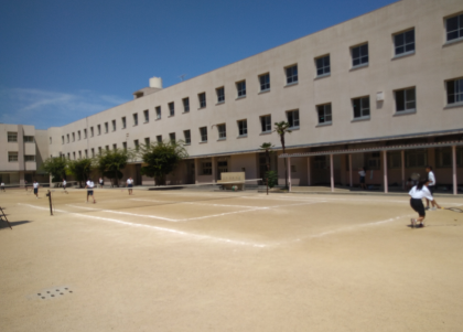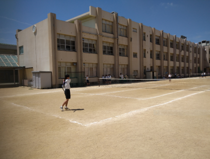 中庭テニスコートでは、ソフトテニス部が校内試合を行っていました。暑さに負けず、がんばっています!