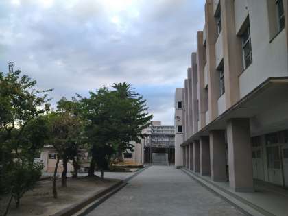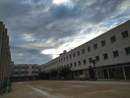 夕方の学校の様子です。朝、昼のみなさんの躍動感あふれ、活気いっぱいの姿が見られる空間から、夕方は、ひっそりと静かな時が流れています。