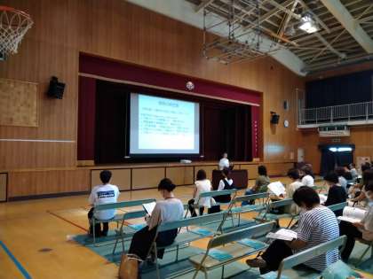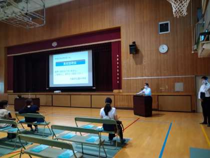 まずは、学校長より、今回の学校説明会開催にあたり、開式の言葉がございました。その中で、全国学力学習調査の結果について触れ、保護者の皆様に、3年生みなさんの頑張った結果をお伝えしました。また、部活動においては、プレイヤーズファーストにきちんと則り、結果を出している部活動が多いことにも触れられました。菫中学生の1学期の頑張る姿をお伝えしていただきました。