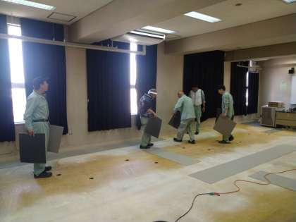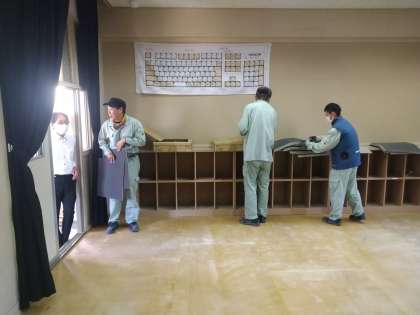 部員のみなさんだけでなく、校内では管理作業員の方々が黙々と作業をしてくださっていました。スクールサポートルームのフロアーの張り替えをしてくださいました。近隣の中学校の管理作業員さんにもご尽力賜りました。「ありがとうございました。」